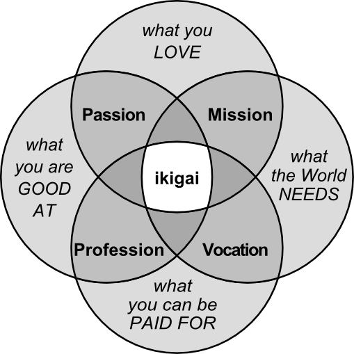 Ikigai is a Japanese concept that means “a reason for being”. This balance is usually found in between your talents and passions combined with the necessity for others to pay you for a living. If you are interested in the concept I invite you to it’s article: