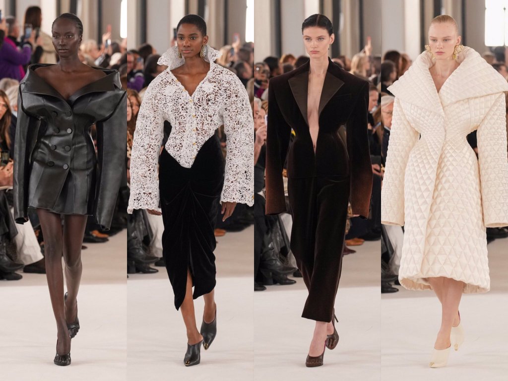 With an elegant base palette of black and white hues, the collection was punctuated with accents of gold, bronze, emerald green, beige and copper, fusing striking evening gowns with sculptural gold heads and bronze molded body accessories. Exaggerated, oversized silhouettes dominated the runway, though they seemed more subtle as a result of pared-down colorways.