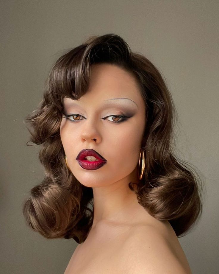 For the eyeshadow, choose dark colors like black, maroon, or bordeaux. Apply it generously on the lids, extending it above the crease for that characteristic ’30s vibe.