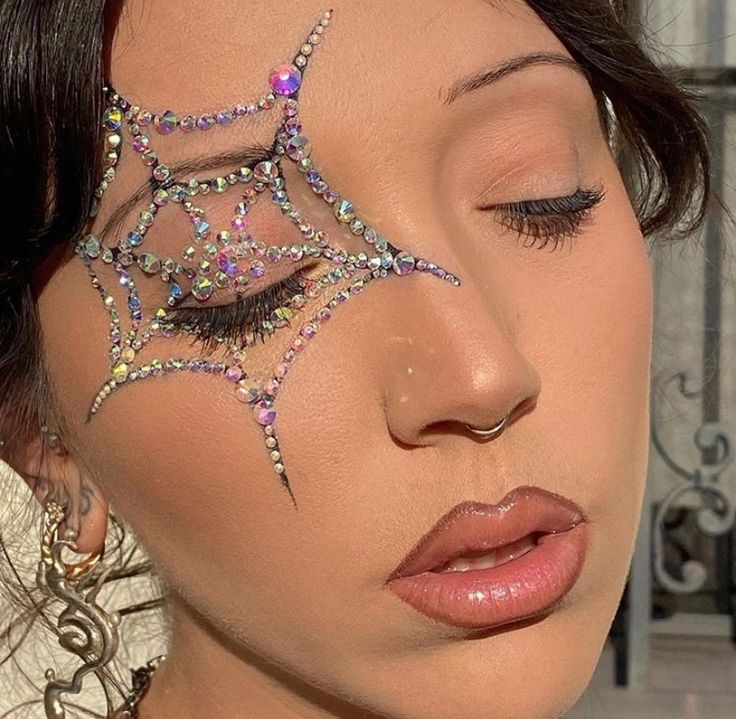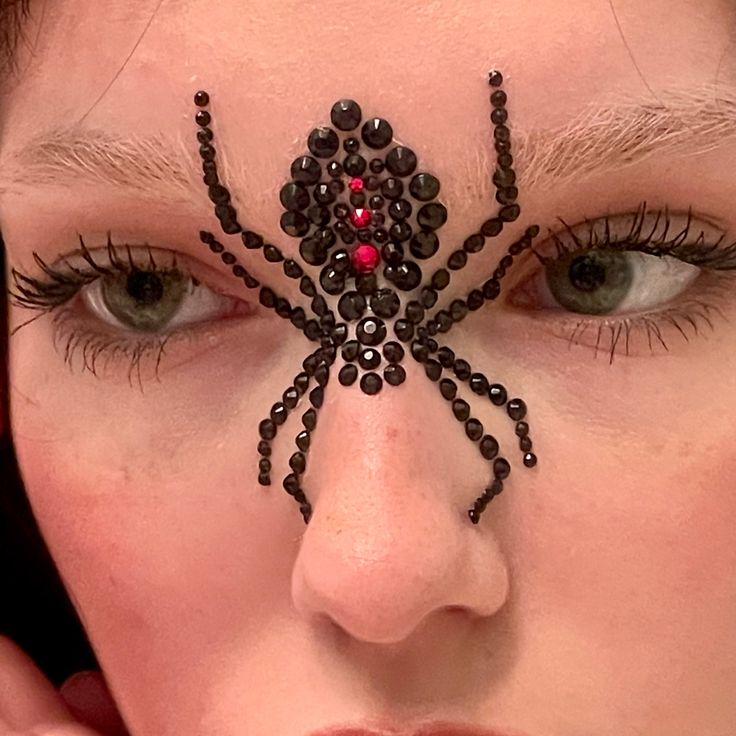 Now, here’s where the magic happens. Grab a fine-tipped eyeliner brush and create a spider on one side of your face. Make sure to add those creepy-crawly legs and maybe even a glistening gem for its body. Repeat this step for a few more spiders on your face, neck, or arms. Feel free to add spider webs for an extra eerie effect. To top it off, line your eyes with a dark eyeliner and apply a few coats of mascara to make those peepers pop.